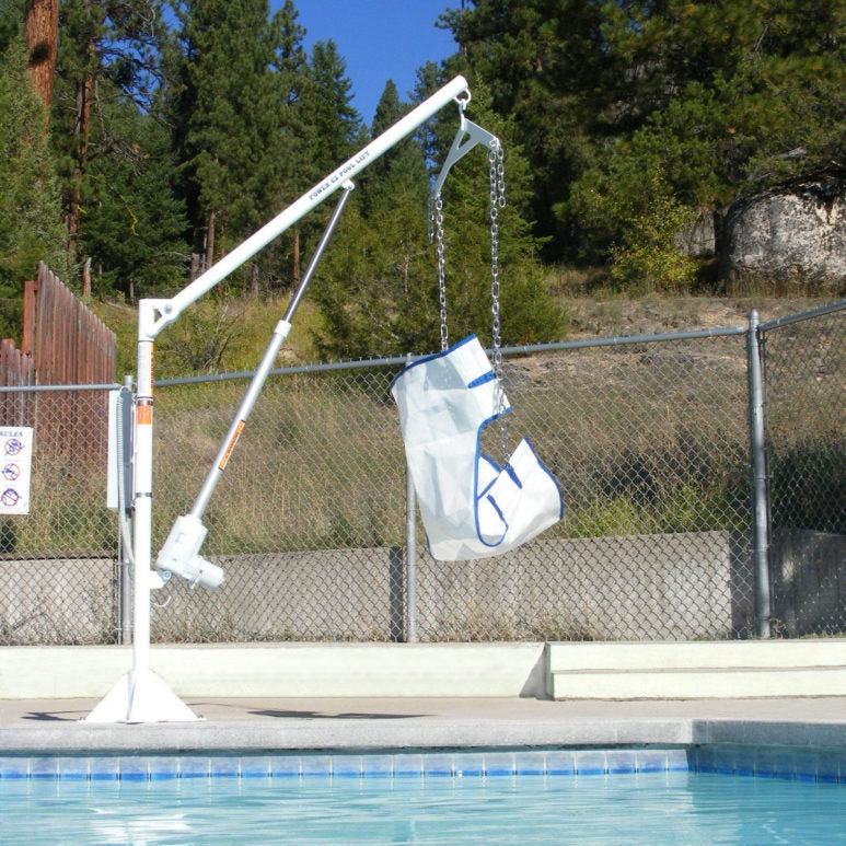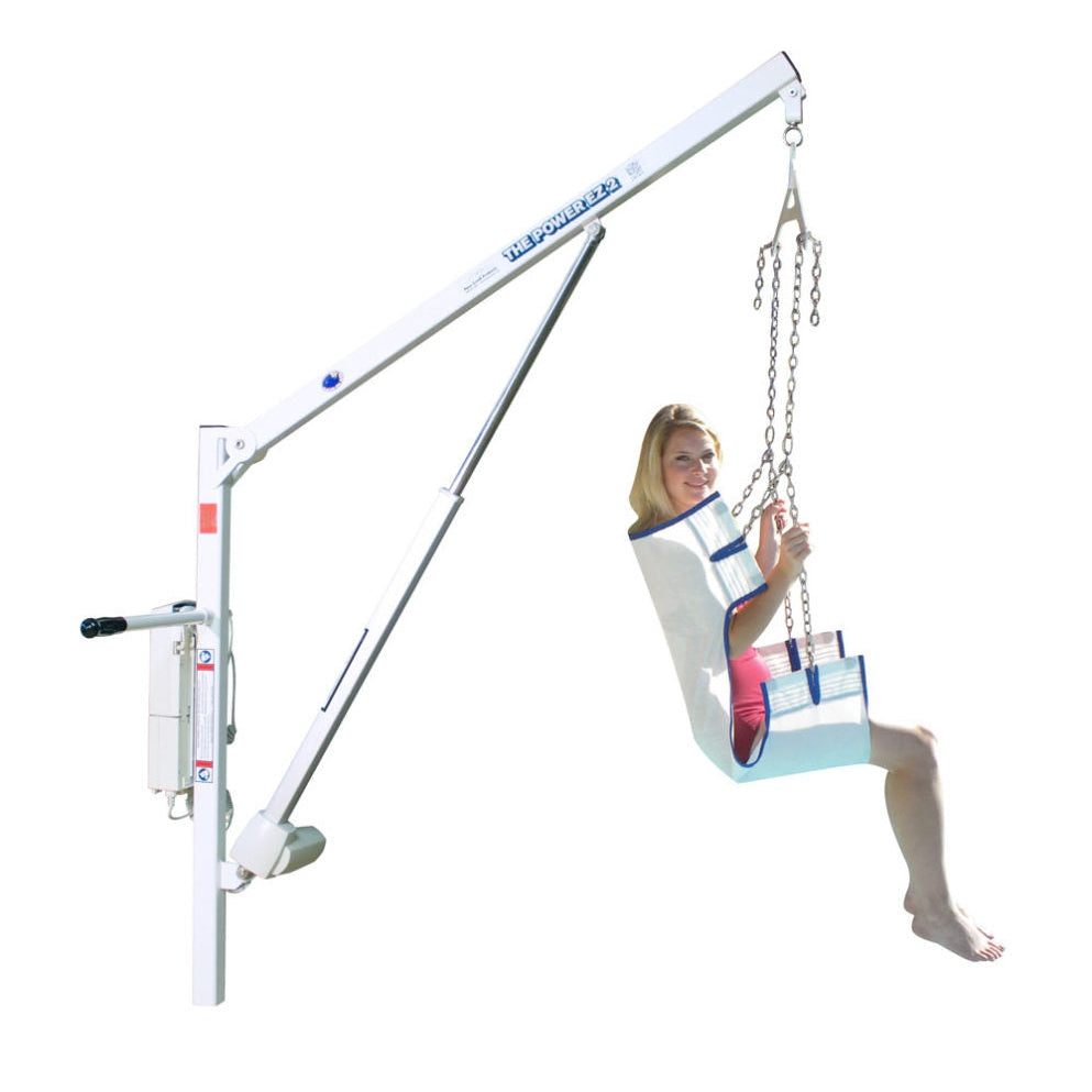 The Power EZ 2 Boat Access / Pool Lift is a versatile battery-powered lift designed to handle up to 400 pounds. It comes with a secure and comfortable sling-style seat, ensuring user safety. Highly portable, this lift can be easily stored or moved to different docks or pool areas. The battery operation allows caregivers to remain close to the patient while using the handset control, highlighting the convenience and simplicity of the EZ lift series. Additionally, this lift excels at providing access from dock to boat.