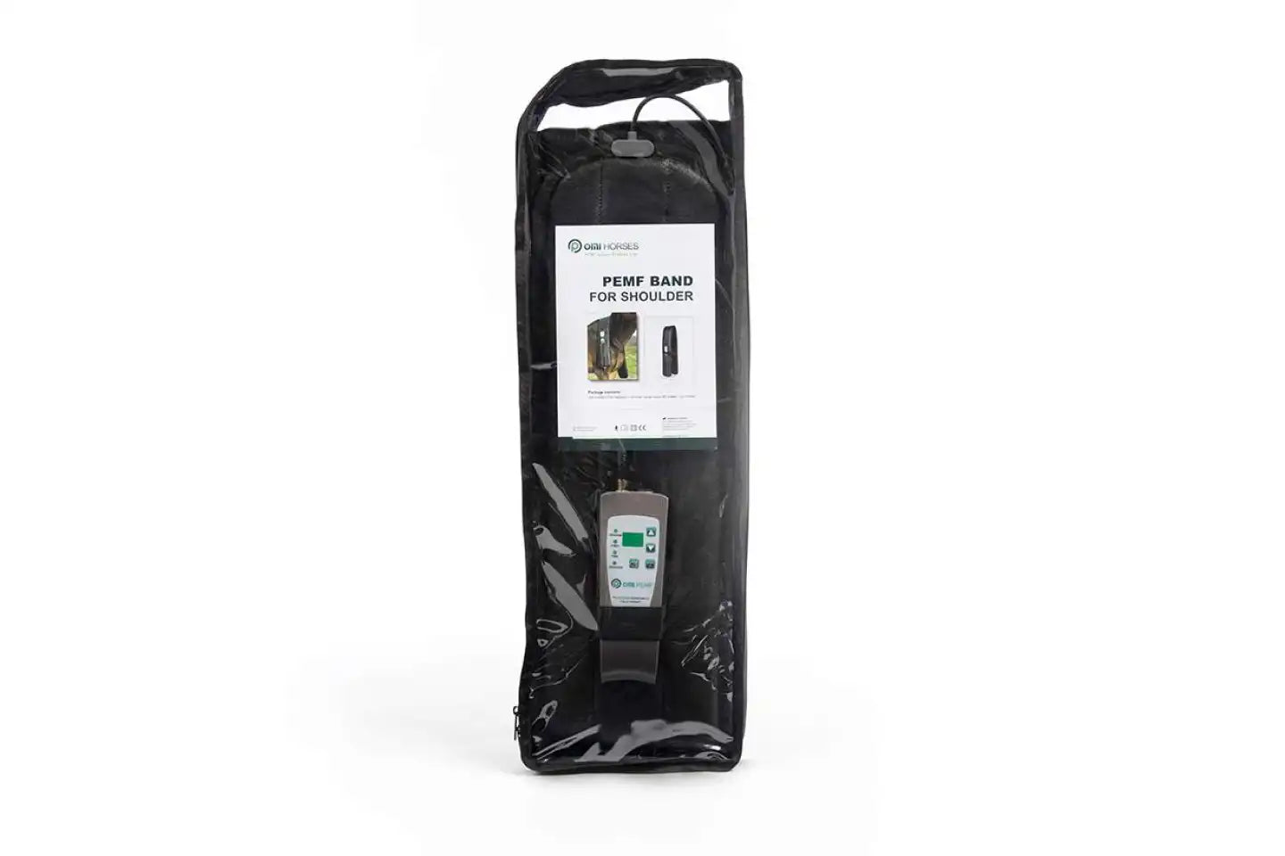 The OMI PEMF Horse Shoulder Band offers targeted therapy for horses. It uses pulsating electromagnetic fields (PEMF) to address common shoulder issues such as injuries, muscle stiffness, swollen tendons, and ligament injuries. The device works by generating magnetic fields, which in turn produce electrical currents in your horse's body. This helps enhance blood circulation, promotes cell health, aids nutrient absorption, and helps remove waste resulting from inflammation and injury. It also supports the natural regeneration of tissues.