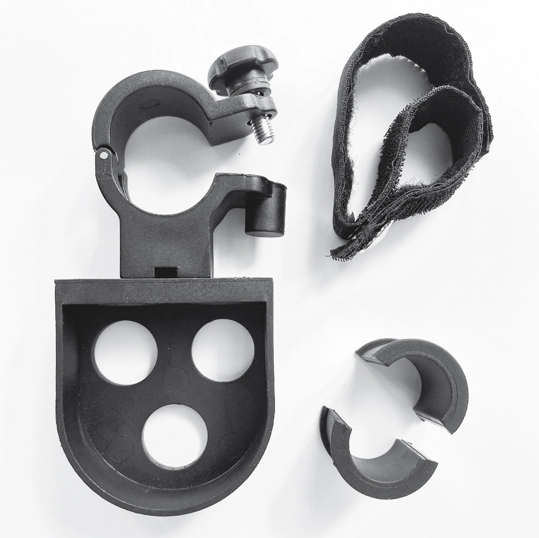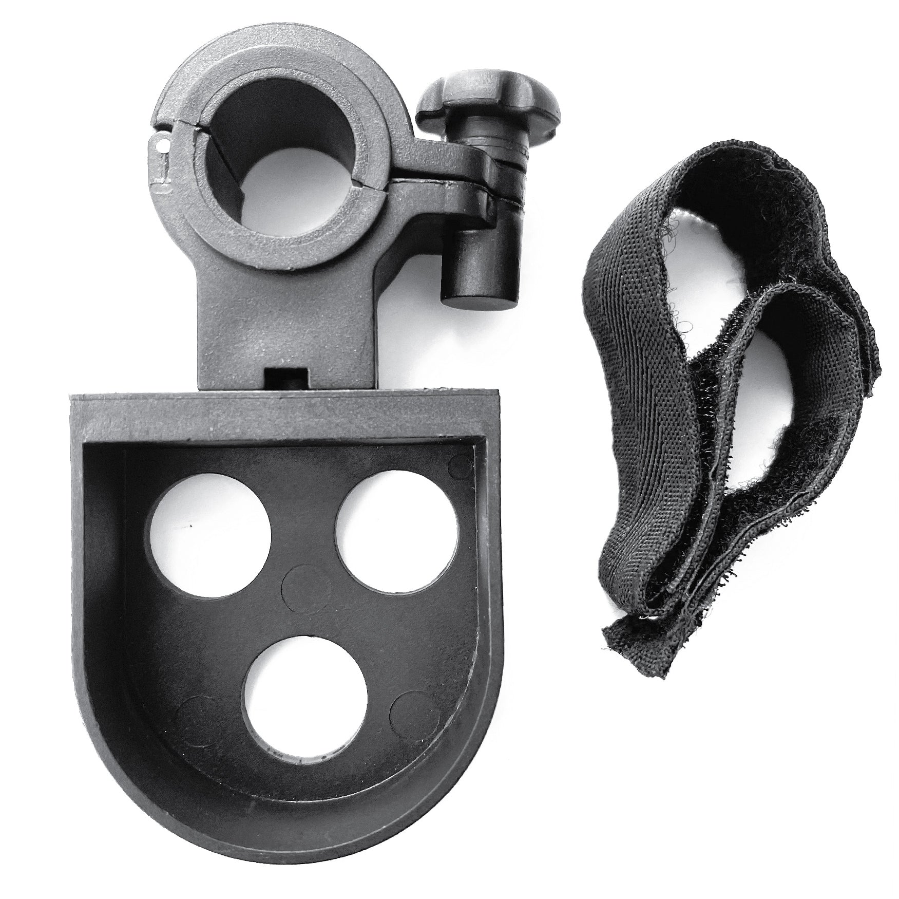 The two-piece set comes with a removable insert that accommodates different cane size diameters up to 1”. Securely hold your cane in place with the included hook and loop strap